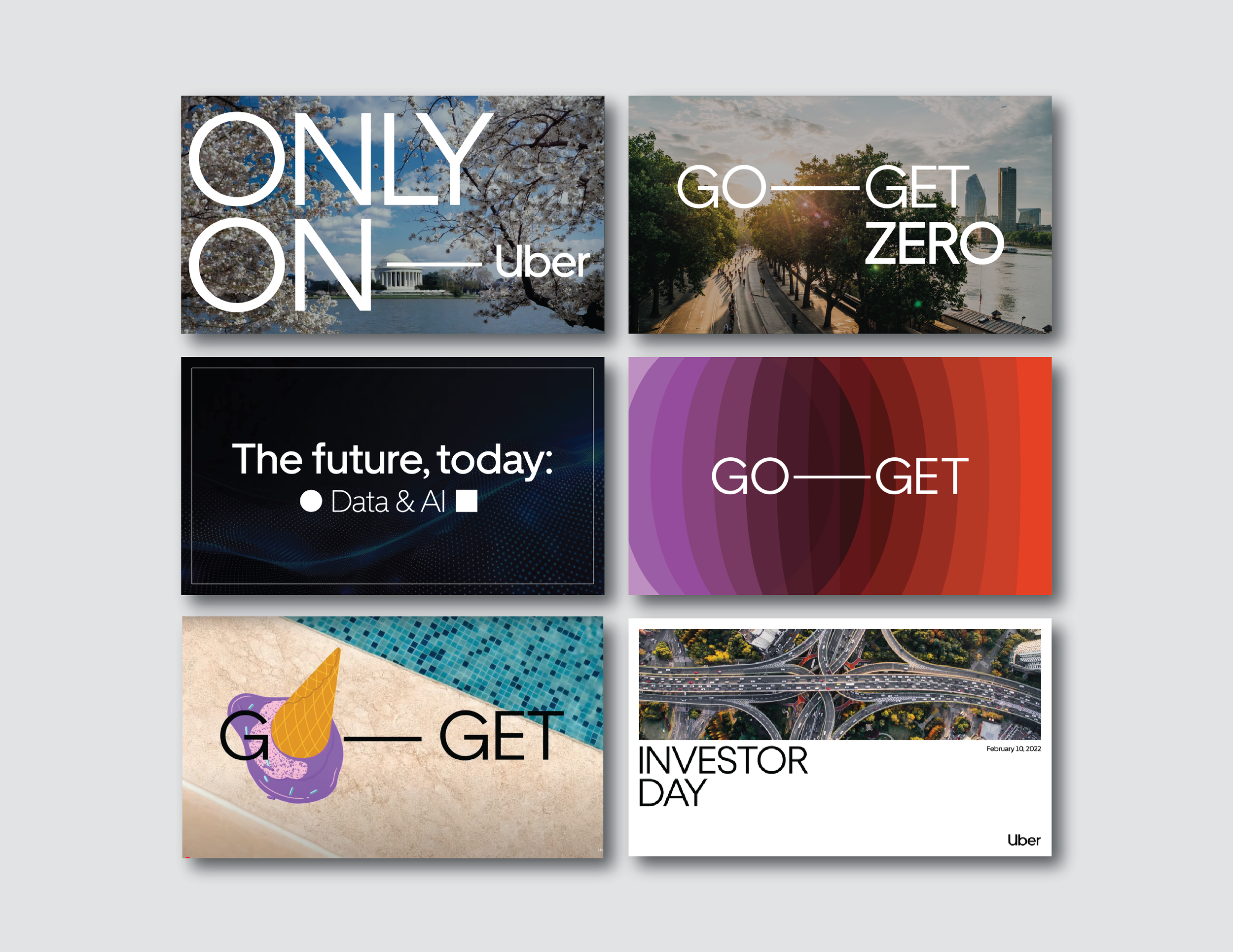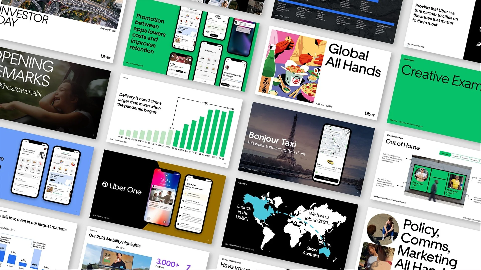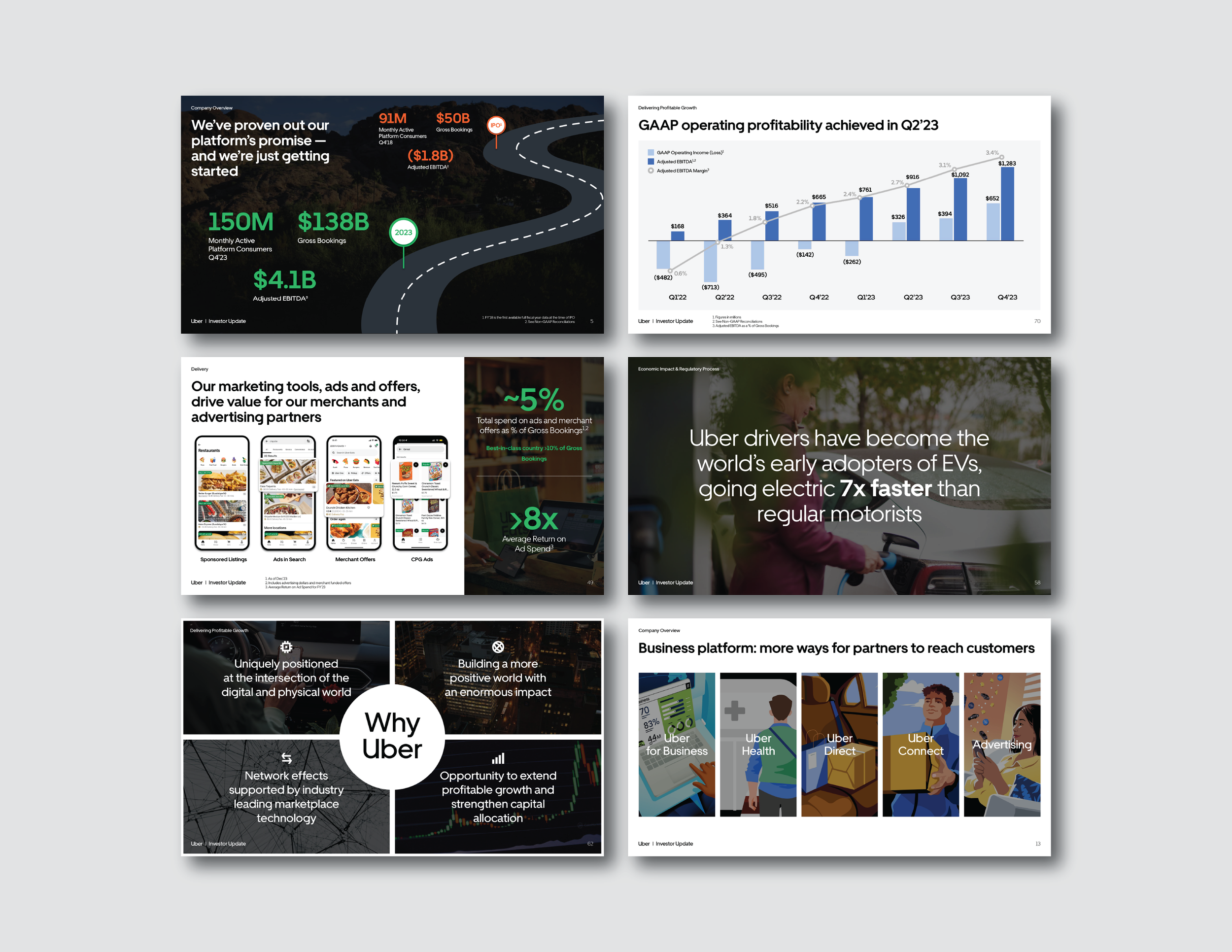 Another key aspect of my presentation support involves a close partnership with Uber's Investor Relations team. Over the years, I have contributed to the design of slide layouts for various IR publications, including quarterly earnings reports and Investor Day presentations.