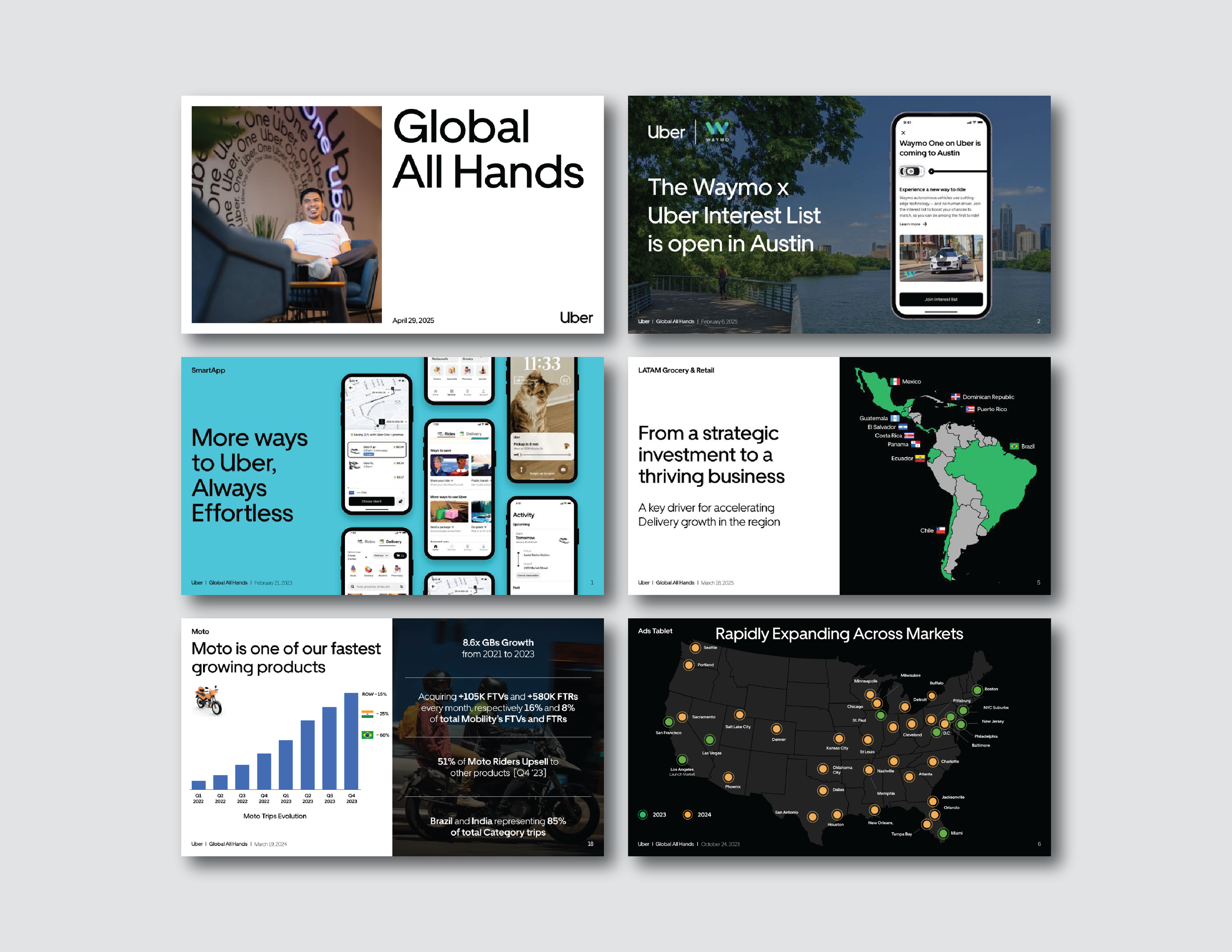 Bi-weekly, I provide presentation design support for Uber's internal Global All Hands. This hour-long live session, led by the CEO, serves as a platform for sharing key company announcements, new partnerships, product updates, and other important communications.